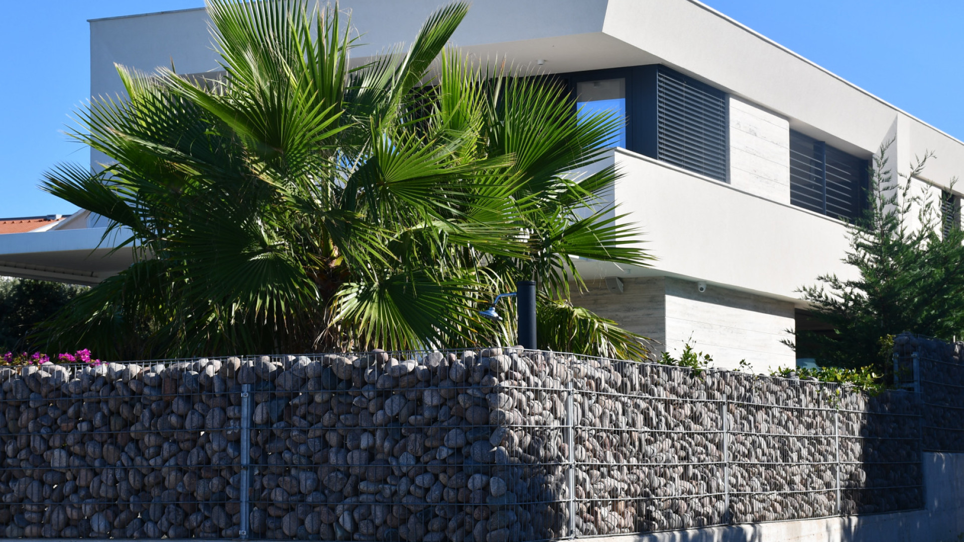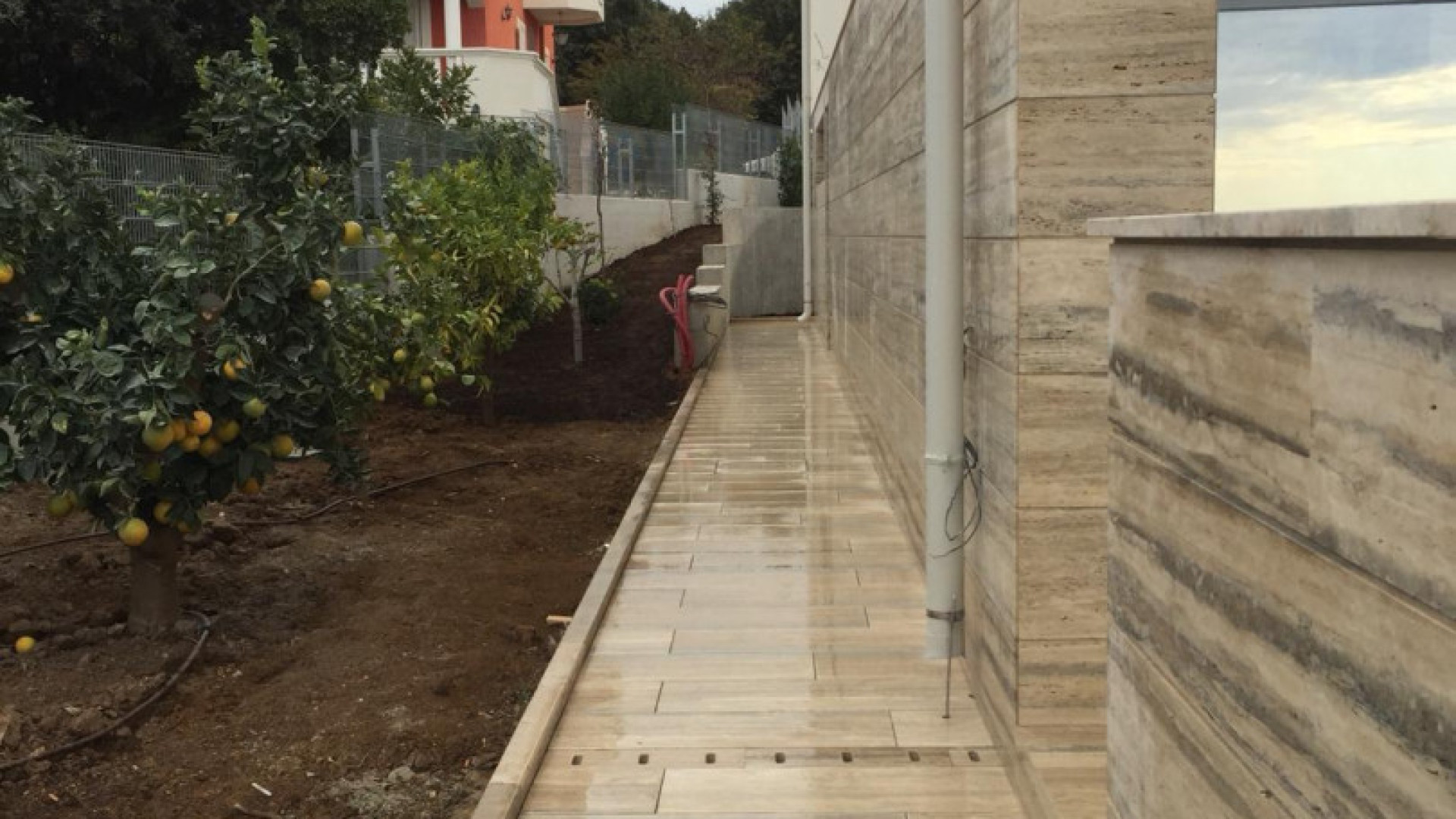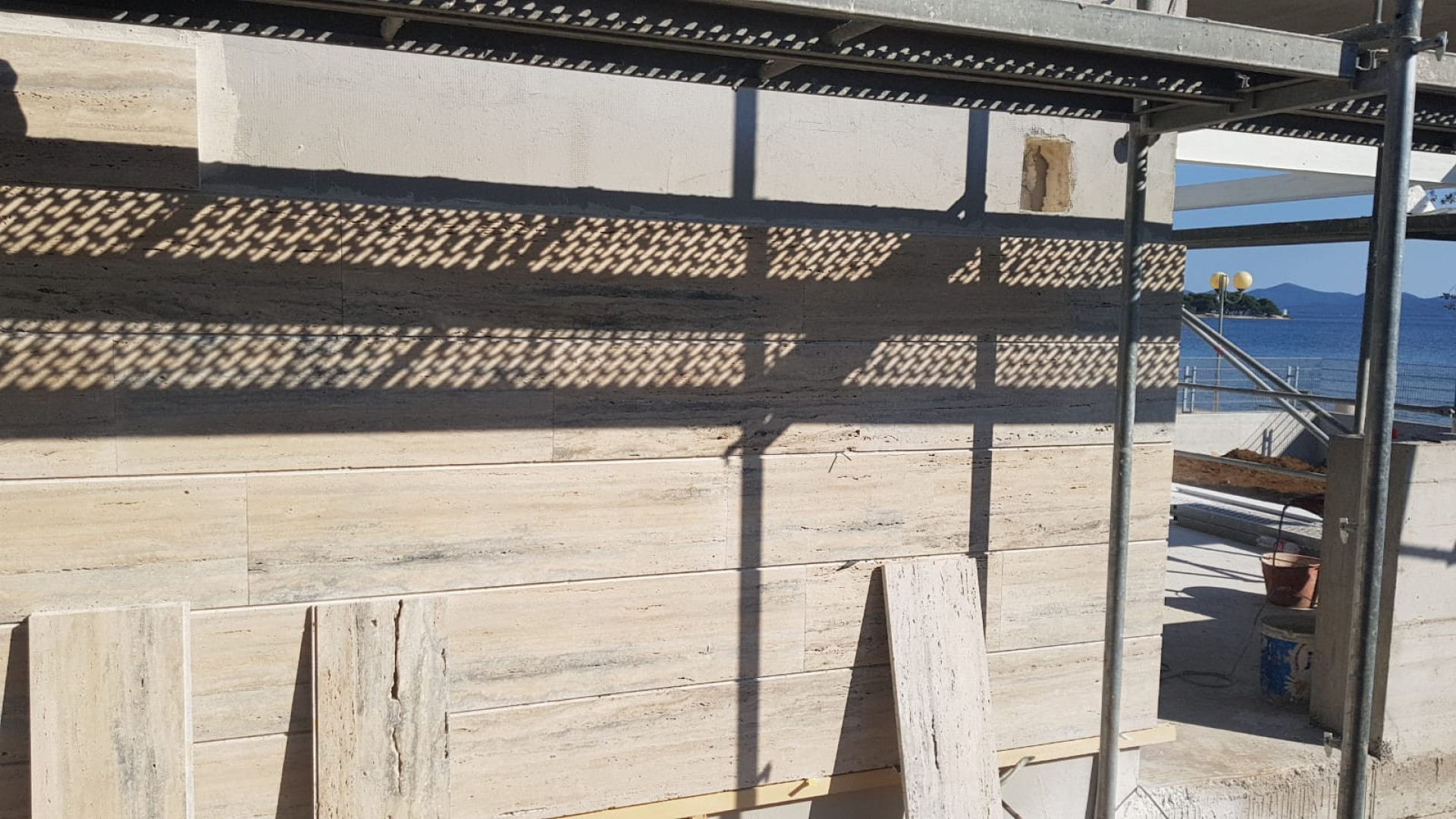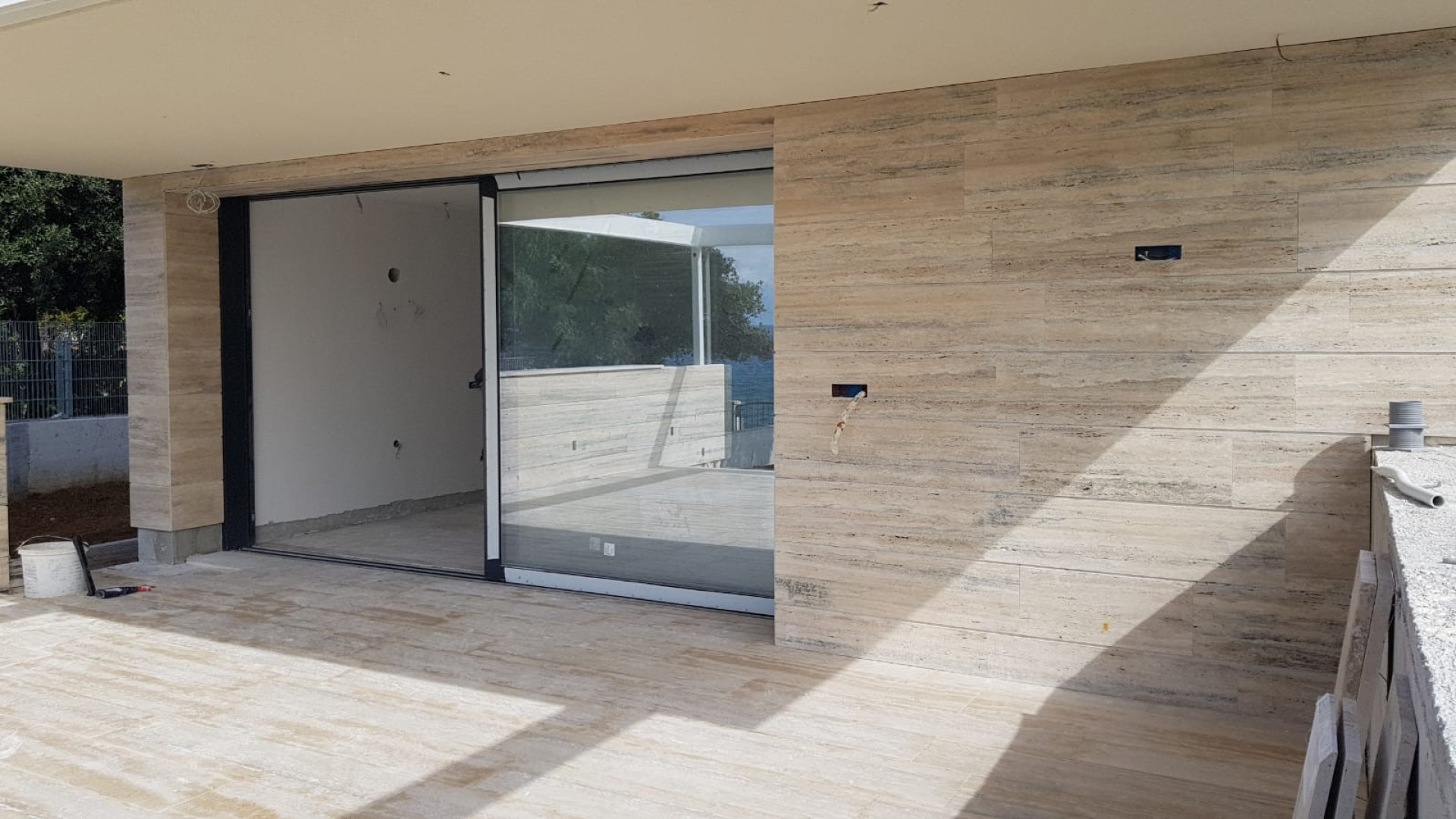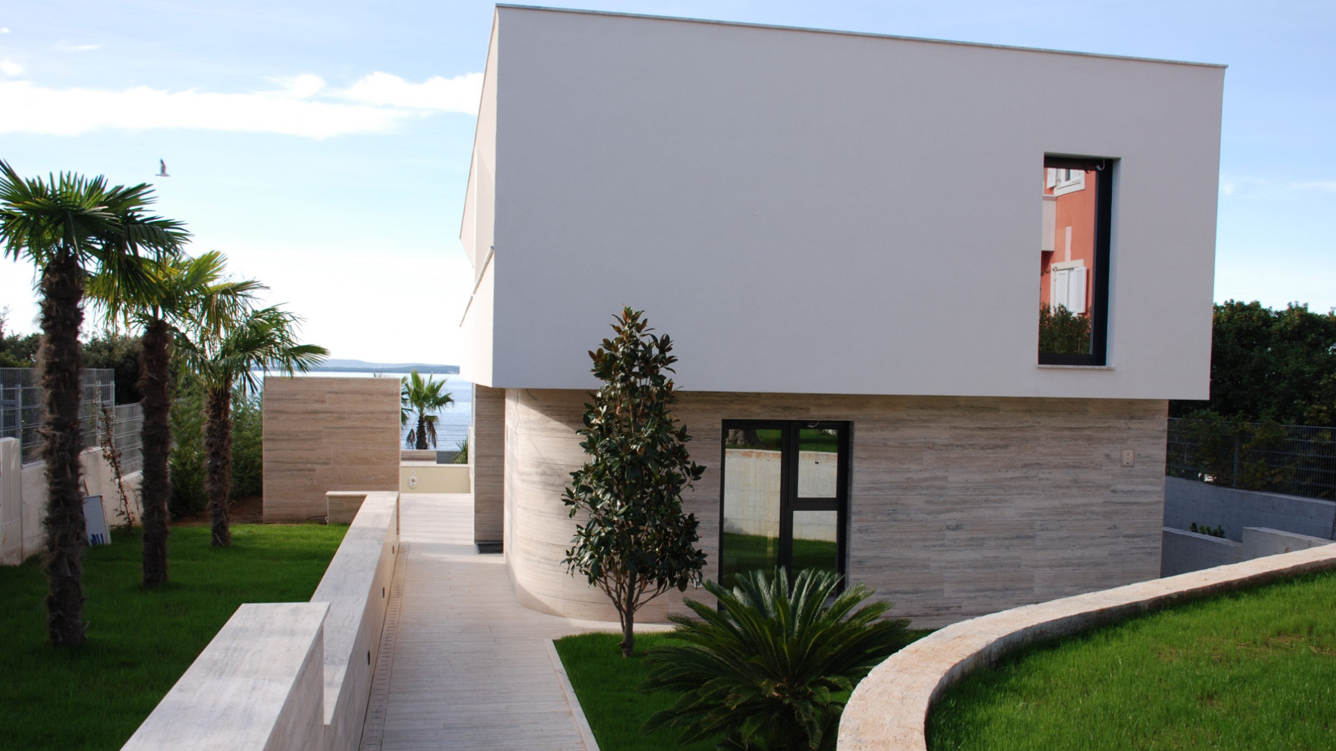 Tato luxusní vila byla postavena na pozemku v první řadě u moře, kde stál původně starý dům. Dům je z velké části obložen travertinem, který dává domu jedinečný a nádherný vzhled. Dlouholeté zkušenosti pomohli k tomu, aby dům nejen dobře vypadal, ale zároveň byl prakticky řešený.